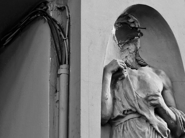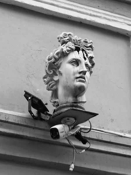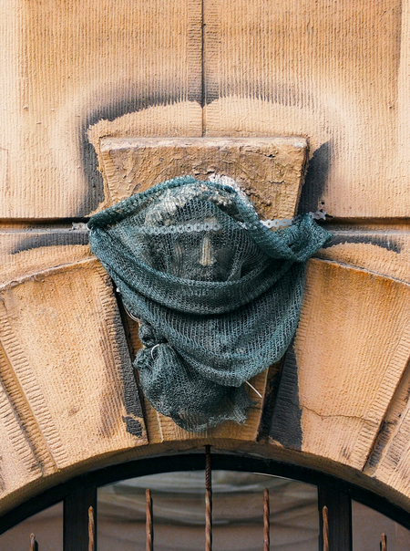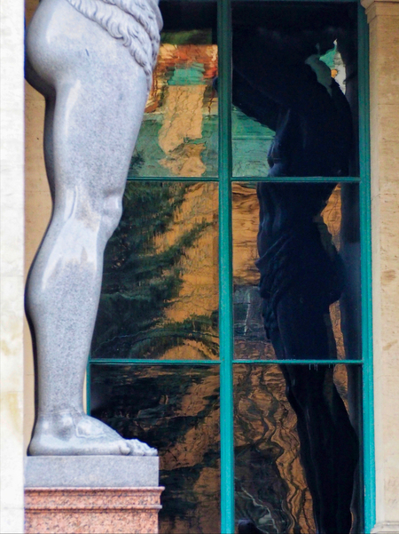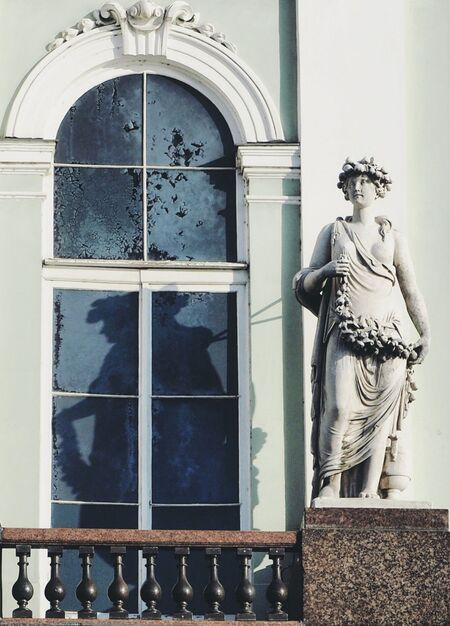 Мой Петербург — безлюдный, спрятанный за парадными фасадами, сведенный на фотографиях к плоскости или фрагментам, но тем не менее узнаваемый по характерным для него деталям. Населяют его лишь скульптуры — немые свидетели красоты его неспешной жизни, которая проявляет себя в сотворчестве времени и природы, в игре отражений, света и тени на старых стенах домов, отсылая к жанру магического реализма.