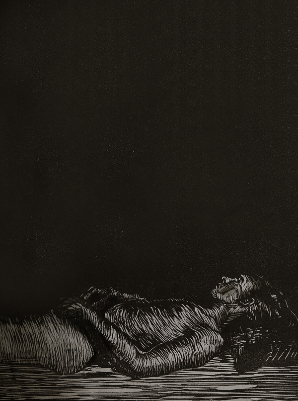 Тело в состоянии покоя неопределенно, как фигура с посмертной фотографии викторианской эпохи. Движение внутри инертной плоти, либо инерции внутри живого тела. Серию линогравюр составляют люди, вытесненные из контекста жизни и смерти. Точка невозврата или неуловимого будущего. Движение уже немыслимо, всё это неразрешимая пауза, а плоскость для сна — и смертный одр, и ложе для второго дыхания. Момент «сейчас», есть один неоднозначный кадр от всей ленты времени.