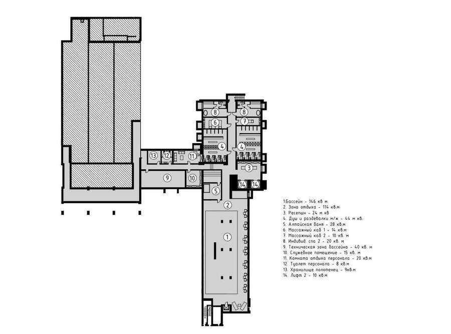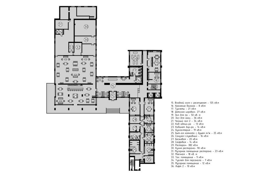 - Респшн - Ресторан - Зал для йоги и мастер классов - Зона для персонала