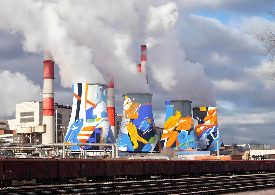 Для двух градирен, которые располагаются ближе к городу, я сделала модульные иллюстрации. Они могут быть помещены как на охлаждающие башни, так и на любую поверхность или конструкцию на территории ТЭЦ или за ее пределами, благодаря возможности разобрать изображение на отдельные составляющие.