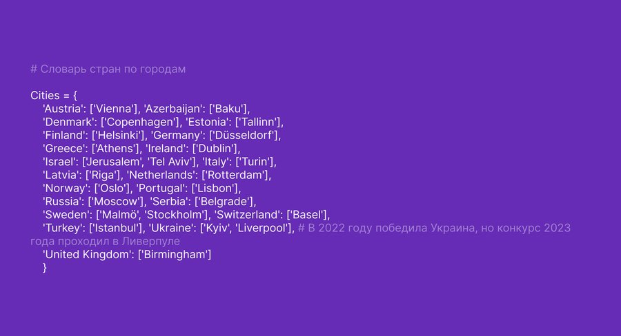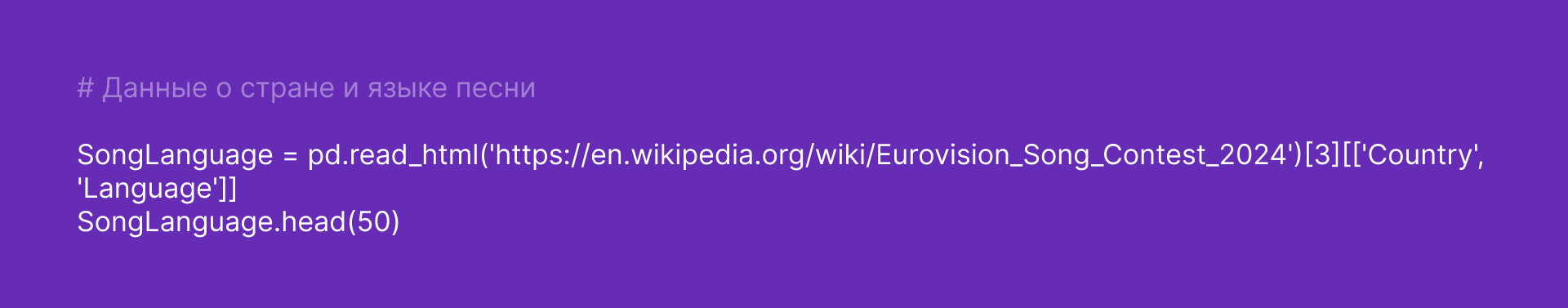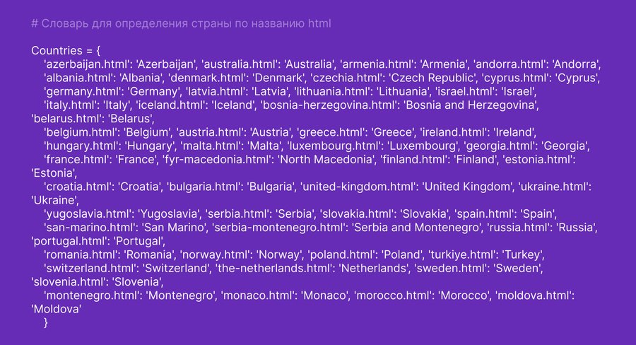 Сайт Евровидения С сайта Евровидения я взяла данные о странах-участницах, их артистах и песнях. Парсинг напрямую с сайта Евровидения запрещен, поэтому для ускорения работы пришлось сохранить HTML-страницы каждой страны.