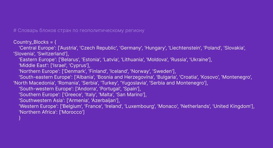 CIA The World Factbook Данный сайт был использован для определения региона, к которому относится та или иная страна. Парсинг данных с сайта сложен из-за неконсистентных данных, поэтому список регионов был собран вручную и занесен в словарь.