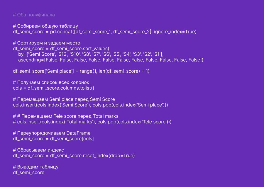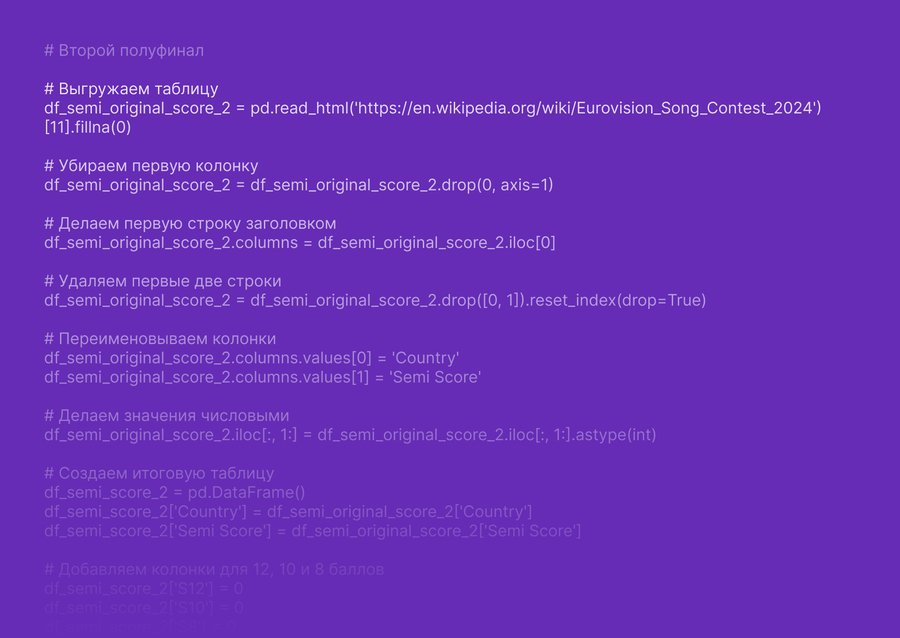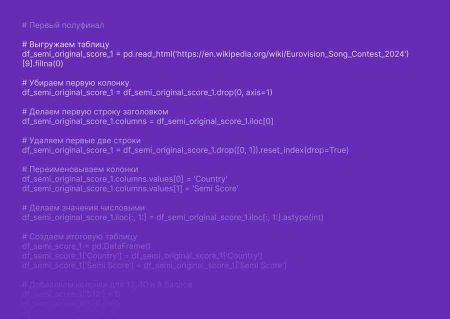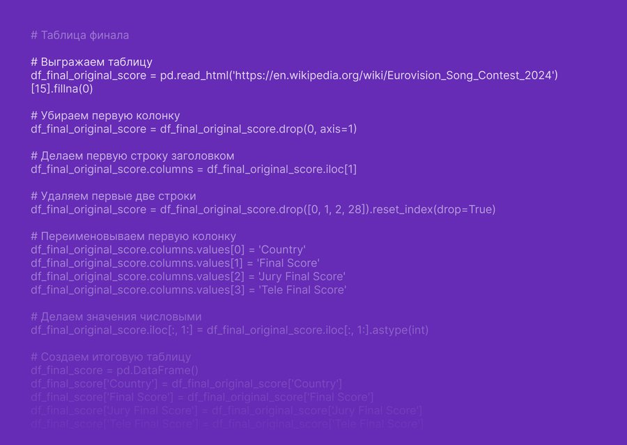 Википедия Для определения места страны в целом на конкурсе был произведен парсинг общей суммы баллов, суммы баллов зрителей, жюри и количества стран, поставивших ту или иную оценку стране-участнице в Полуфиналах и Финале из Википедии.