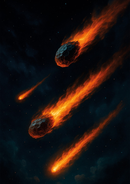 Иллюстрации созданы с использованием DALL-E в ChatGPT. Промты, использованные для генерации: «Realistic outer space scene with glowing meteorites streaking across the sky, deep blue cosmic background, fiery orange and warm yellow flames trailing behind the meteorites, soft grey-blue clouds of space dust, stars scattered in the distance, high detail, dramatic lighting, cinematic atmosphere»; «Realistic horizontal image of a massive meteorite blazing through outer space, viewed from the side. The background is deep blue with scattered stars and grey-blue cosmic clouds. The meteorite leaves a long, fiery trail in vivid orange and warm yellow, lighting up the surrounding dust. High detail, dramatic lighting, wide composition, cinematic sci-fi atmosphere»