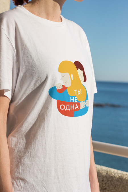 В качестве дизайн решения для принта для футболки было решено отрисовать векторное изображение в Adobe Illustrator, изображающее обнимающихся людей. Такое решение было принято для того, чтобы изобразить ценности НЖКЦ: безопасность, уважение, право на защиту, помощь. Кроме того, яркое изображение должно привлечь молодую аудиторию 20-35 лет. В качестве цветового решения были выбраны основные цвета из гайдбука НЖКЦ. Шрифт был выбран также из гайдбука — Circe Bold. Данные цвета и шрифт были выбраны, чтобы сохранить фирменный стиль, принятый в НЖКЦ.