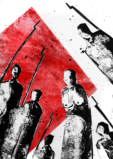 С помощью смешанной техники в проекте отражены чувства и впечатления от прочтения произведения. Серия состоит из двенадцати частей. С каждой иллюстрацией появляется всё больше разрезанных кусков, которые символизируют раскол общества. Лейтмотив всех картин — часть красного полотна на заднем плане.