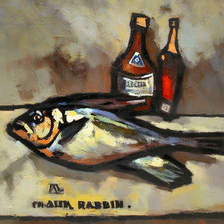 prompt = 'a painting in RABIN style, oil painting, still life of a fish and a bottle of vodka'; lora_scale = 0.8