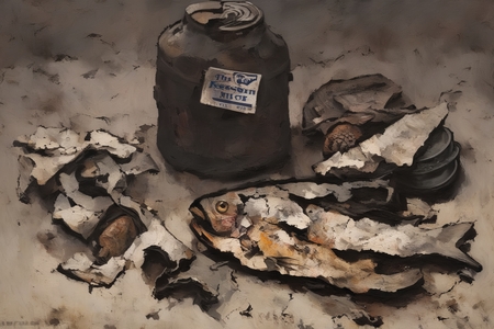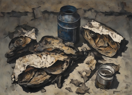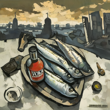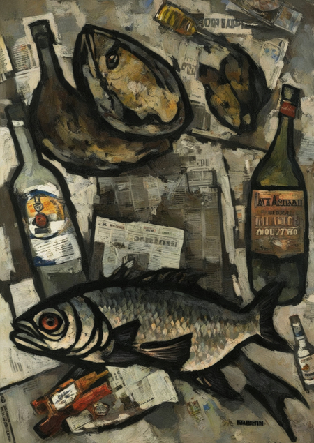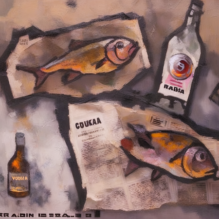 [+ negative_prompt] prompt = 'a painting in RABIN style, oil painting, fish, crumpled newspaper, and vodka bottles'