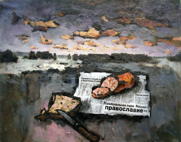 1. Оскар Рабин. Облака, колбаса и православие. 2012 // 2. Изображение, сгенерированное нейросетью