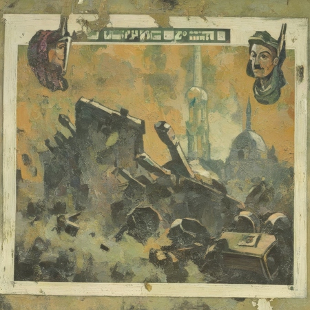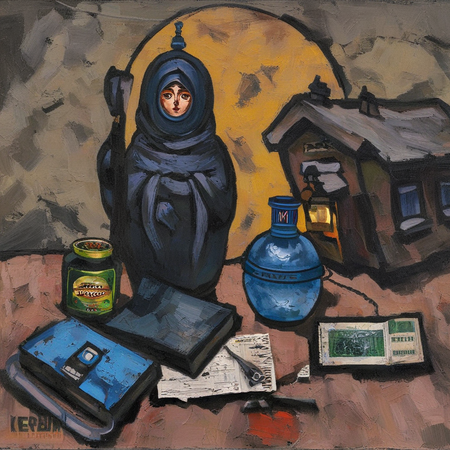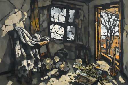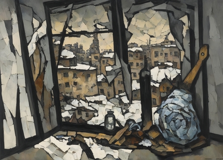 prompt = 'a painting in RABIN style, oil painting, warped Soviet-era passport lying in a puddle, bent fork stuck in a moldy crust of bread, cracked window with frost creeping along the edges…'
