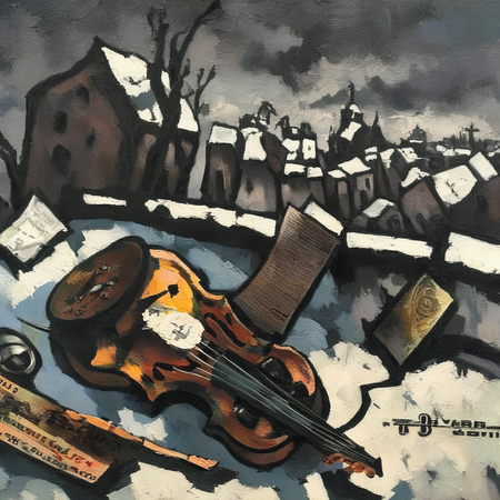 prompt = 'a painting in RABIN style, oil painting, broken balalaika leaning against a cold radiator, dented tin cup with traces of cheap wine, yellowed newspaper…'