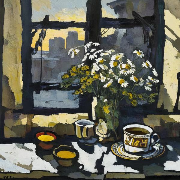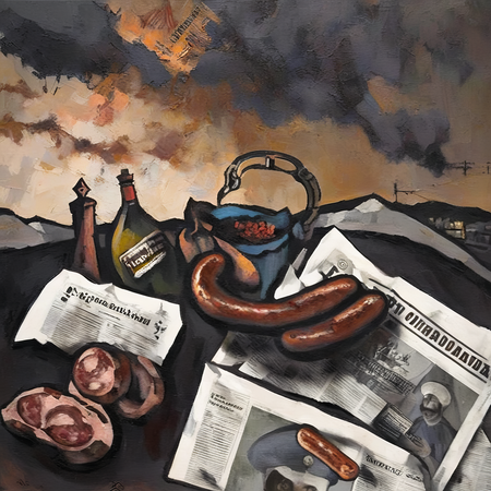 prompt = 'a painting in RABIN style, oil painting, crushed cigarette pack (Belomorkanal) on a splintered wooden table, half-empty glass of murky tea, torn train ticket to an unreadable destination…'