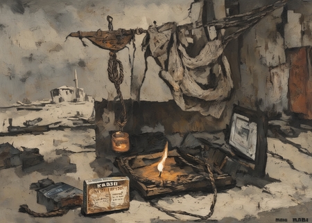 prompt = 'a painting in RABIN style, worn-out boots in dried mud, empty can of condensed milk with a jagged lid, a single dried fish head on a chipped plate, dim light from a kerosene lamp'
