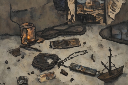 prompt = 'a painting in RABIN style, oil painting, frayed rope hanging from a rusty nail, empty matchbox with a faded ship illustration, half-burnt candle in a pool of wax…'
