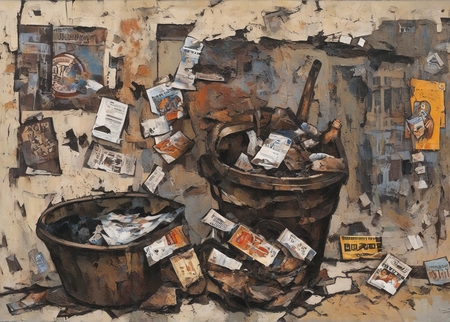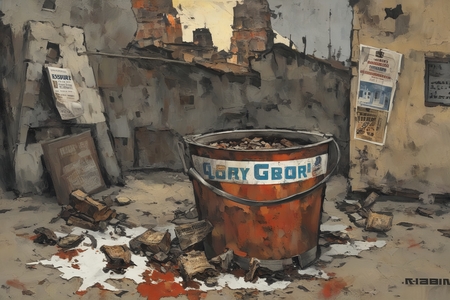 prompt = 'a painting in RABIN style, bucket filled with rainwater and floating cigarette butts, chipped enamel bowl with cold borscht stains, crumpled propaganda poster ('Glory to Labor! ')…'