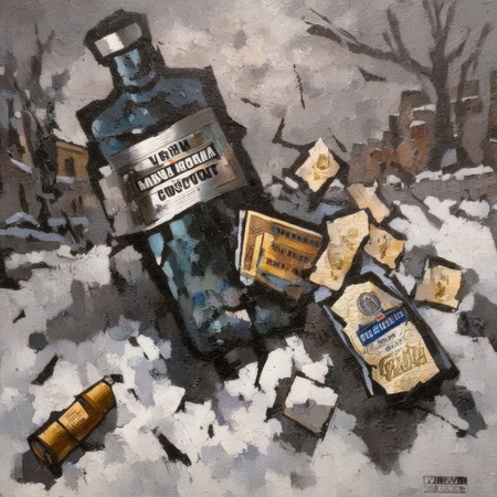 1. prompt = 'a painting in RABIN style, shattered vodka bottle in the snow' // 2. prompt = 'a painting in RABIN style, cigarette butts in a tin can'
