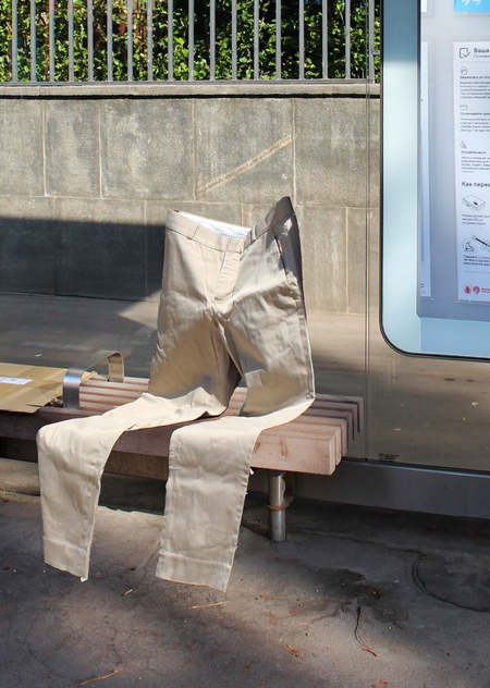 На мусорках возникают инсталляции из выкинутой одежды, которые доносят идею о том, что переработать так же просто как выкинуть. Одежда сама переползает из обычного бака в бак для переработки. Такая визуализация выражает идею о том, что владельцам ненужных вещей даже не надо шевелить пальцем, чтобы отнести вещи в пререработку: баки как на ладони, а вещи делают всю работу по транспортировке за своих неродивых хозяев.