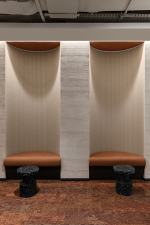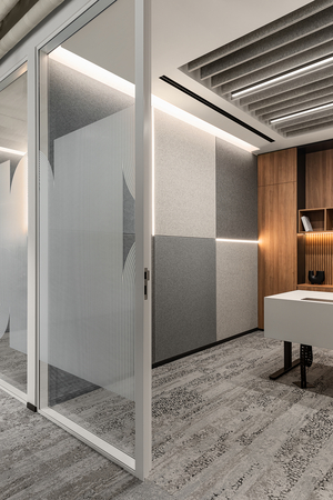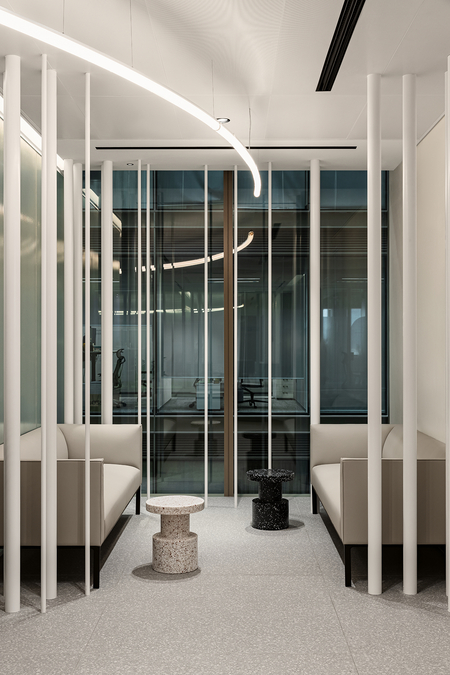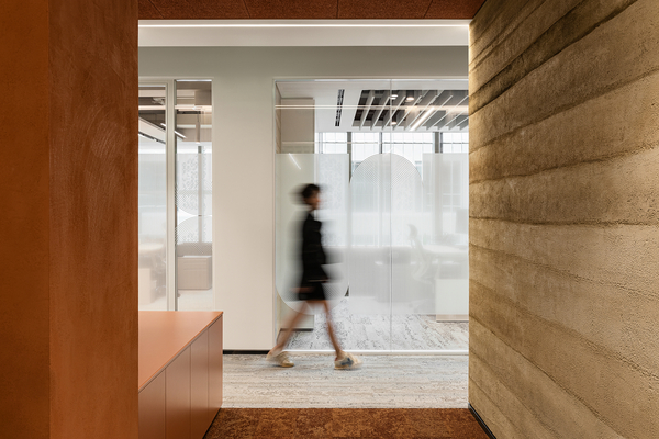 The interior draws inspiration from several distinct themes: the first pattern references compressed earth textures, with wall panels forming a multi-layered visual effect that conveys industrial complexity and the interwoven nature of work processes. This design choice embodies stability and the fluidity of time, while also creating a memorable visual accent.