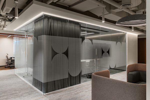 Its key element the «Golden Petal» is a six-meter-long pivoting partition finished in natural gold-toned metal. It incorporates a digital display showcasing corporate content and, depending on its position, can transform the space into a meeting room, conference hall, media center, demo zone, or informal event area.