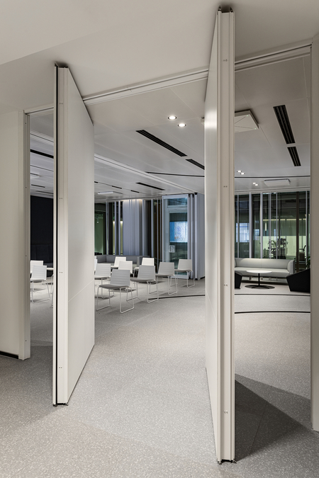 Surrounding the central hub are executive offices, top-management workspaces, open-plan work areas, and various meeting rooms. A diverse range of workstations supports the company’s hybrid business model, ensuring optimal working conditions for different departments.