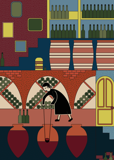 «Пхали Хинкали» я выбрала детализированный стиль с обилием текстур, которые сочетаются с проработанными уютными интерьерами ресторанов. Для каждой иллюстрации были подобраны ассоциации с грузинской культурой.