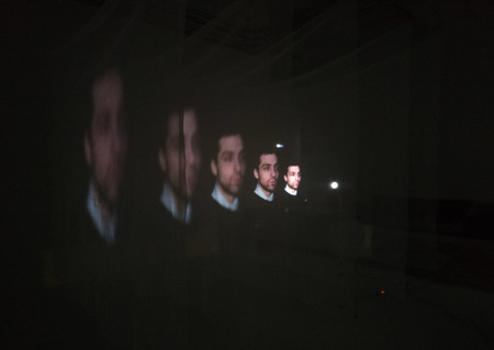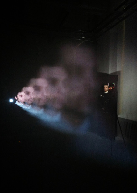 Интерактивная инсталляция предоставляет зрителю возможность взаимодействия с прозрачными экранами через камеру видеонаблюдения, что позволяет в реальном времени увидеть телесное расщепление своего образа в медиа.
