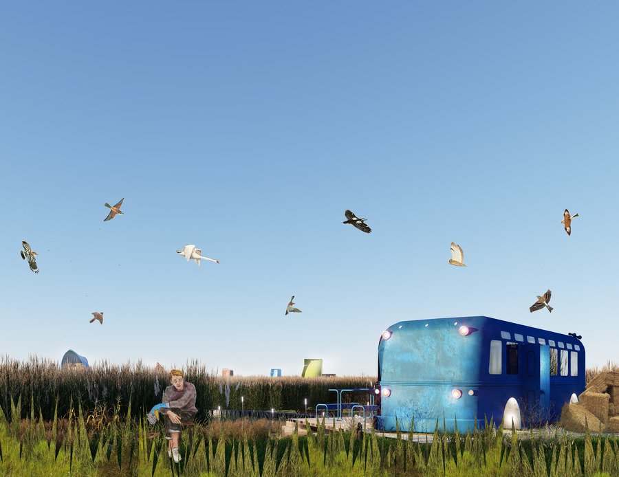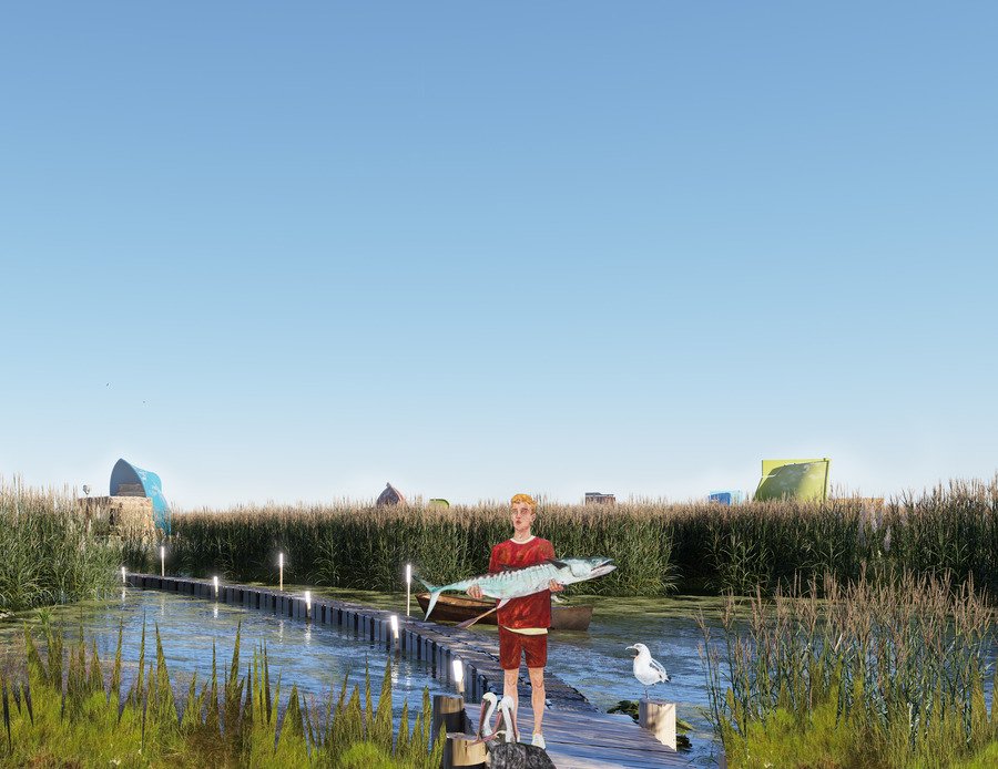 1. Территория рыбацкого городка, 2. Автобус (ресепшен и кафе), 3. Типовой дом, 4. Естественный ландшафт зарослей