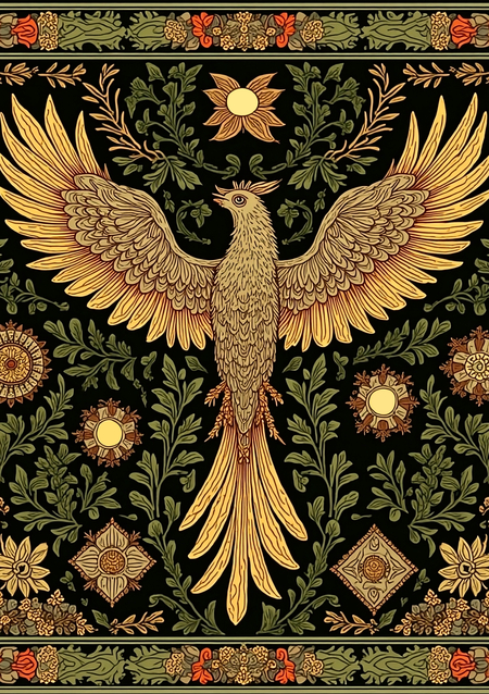 Create a stunning pattern for a 130×130 cm shawl based on ancient Slavic mythology. Use complex geometric shapes, vibrant floral motifs, and symbolic elements typical of Slavic culture. In the center of the composition, please place the image of the firebird. Ensure high-quality images with rich, vibrant colors that highlight the details of the embroidery. The design should radiate harmony, balance and aesthetic appeal, making it ideal for textiles.