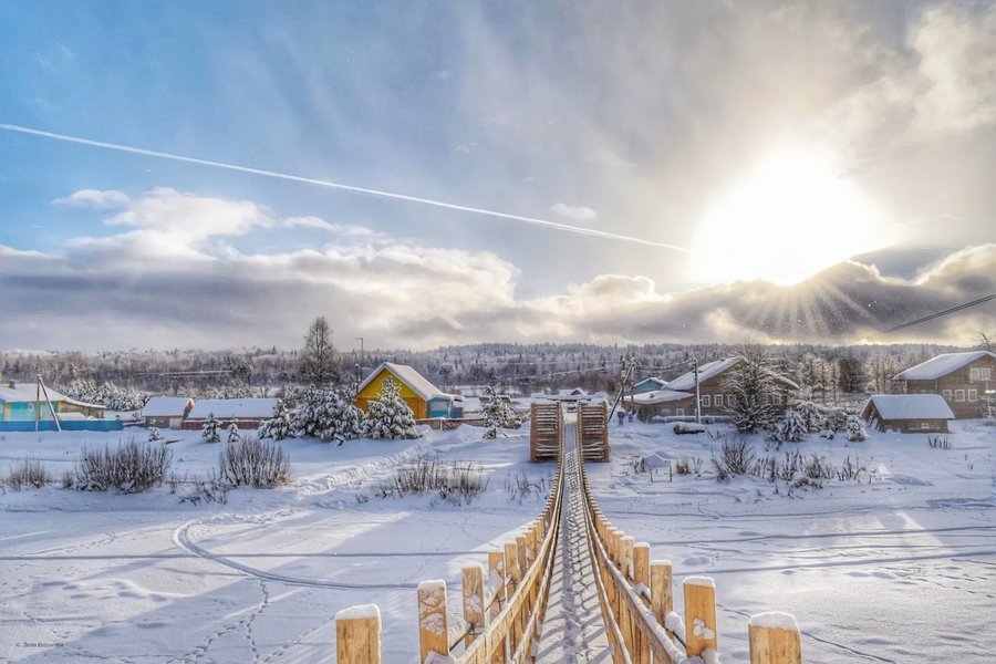 Его расположение особенное — по утрам солнце озаряет жилую часть, а по вечерам на выходе со двора можно любоваться прекрасными закатами. Кроме этого, дом видовой — из большей части окон вид на природу — реку, гору, подвесной деревянный мост. Когда смотришь в такое окно, время как будто останавливается.