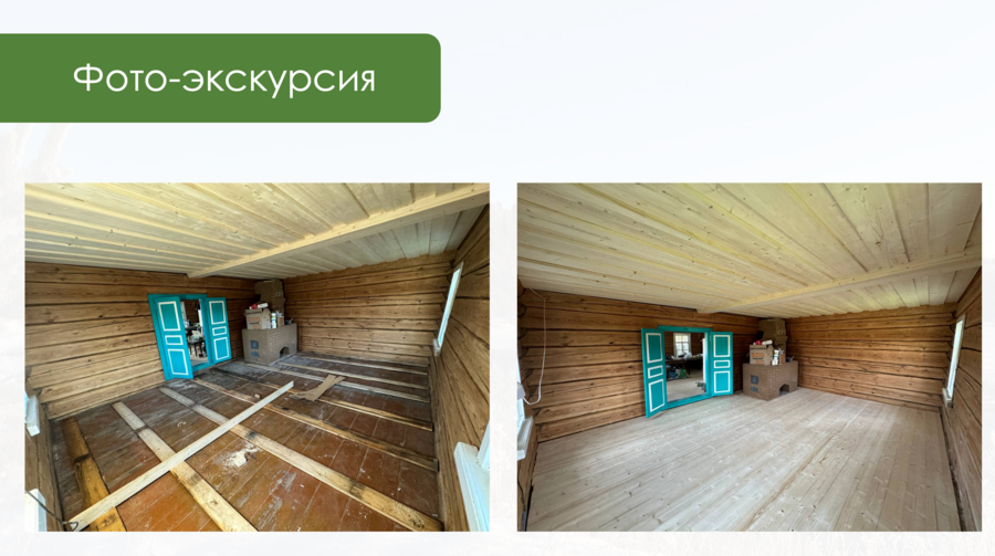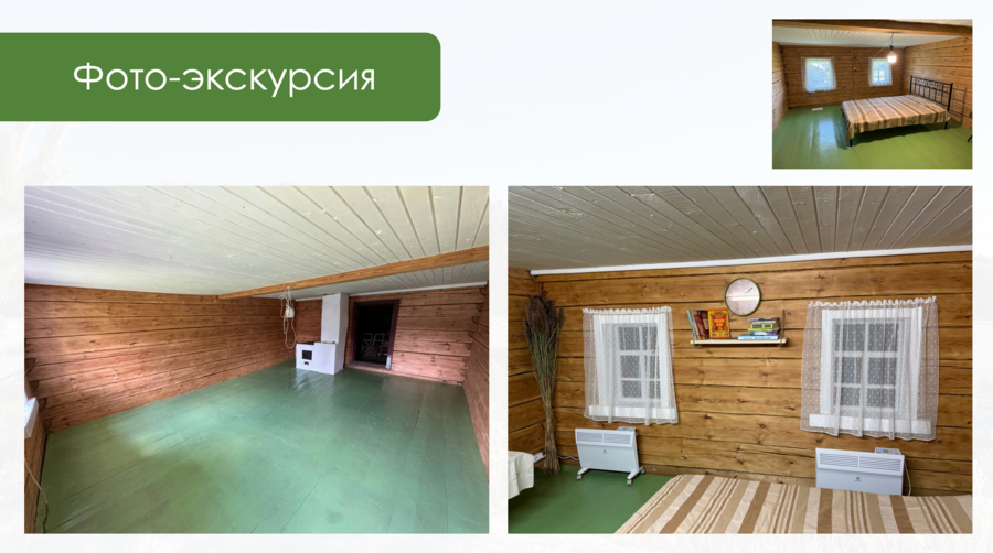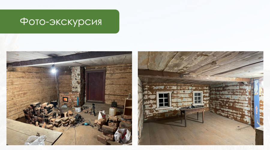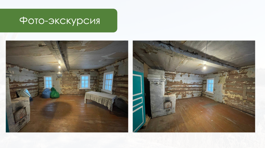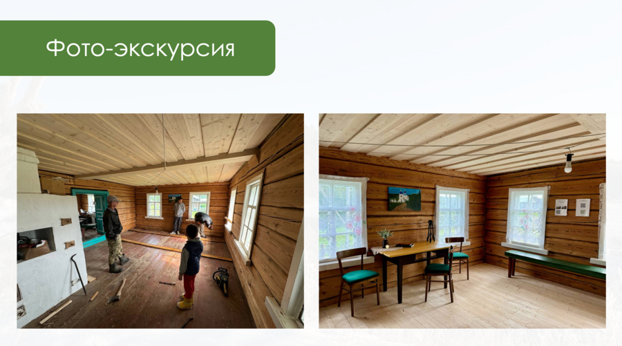 Это старый крестьянский большой дом на севере России (180 кв. м.) — тот, в котором и дом, и двор под одной крышей. При подъезде гостей встретит легкий геометричный забор и большая парковка. Снаружи дом ничем не обшит — круглый сосновый лес прекрасно сохранился и поседел со временем. Каждая часть дома спроектирована именно так как спроектирована с определенной целью — и очень увлекательно его изучать и удивляться мудрости предыдущих поколений. Одна его часть — жилая, она отремонтирована с учетом современных требований, вторая часть — нежилая, в ней сохранено без изменений всё, что возможно — поветь, клеть, хозяйственная комната. То есть под одной крышей гость увидит два века — и наши года, и начало ХХ века.