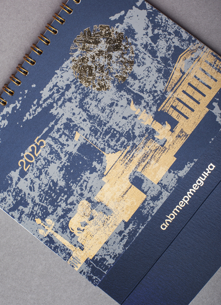 Настольный календарь 2025. Объем блока: 12 месяцев и 4 вкладки. Дизайнерская бумага Colorlab 270, 110г. Печать шелкография 2 пантона, тиснение золотой фольгой.