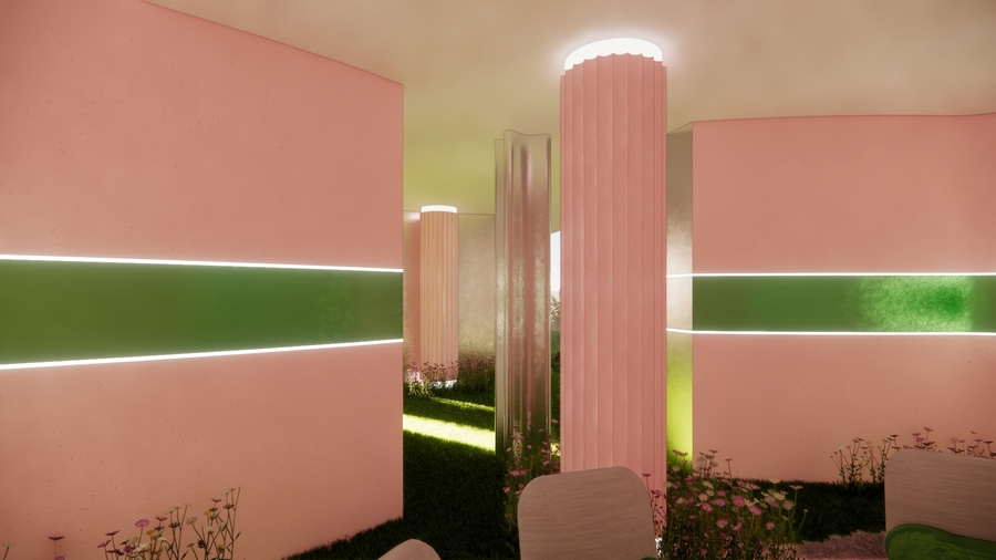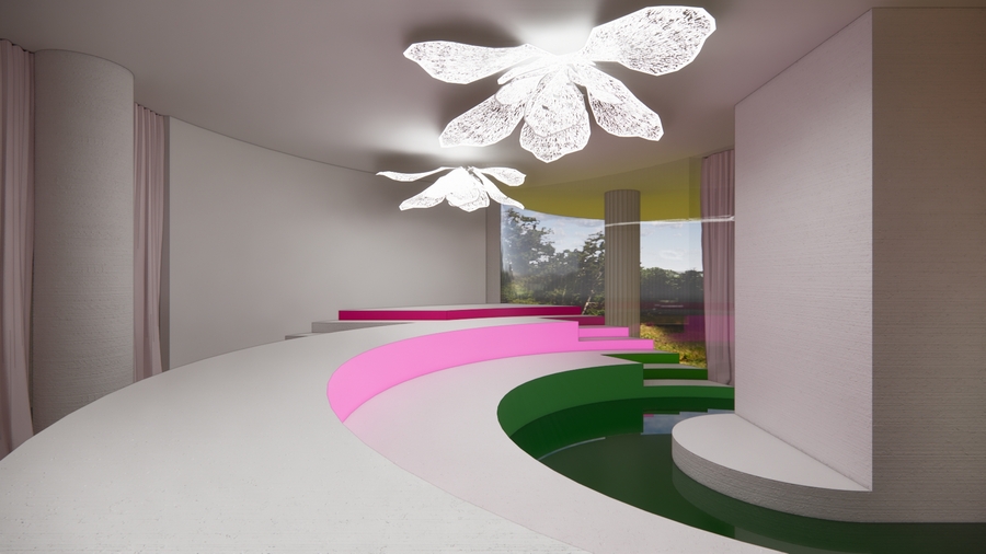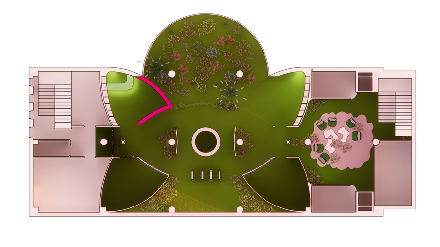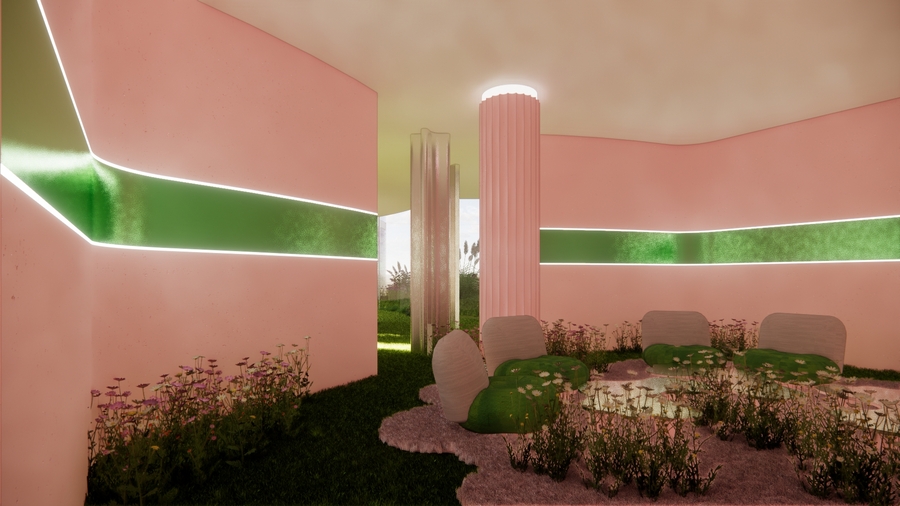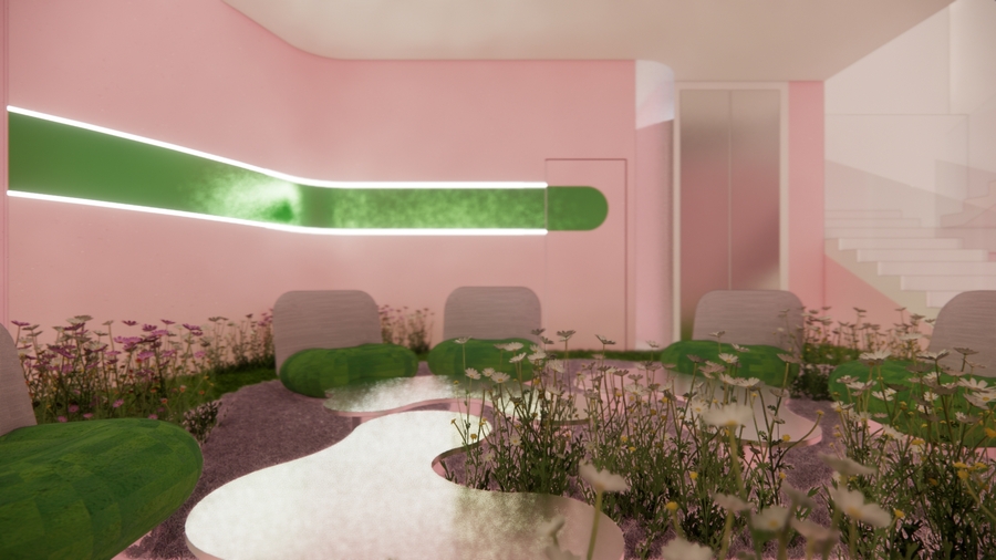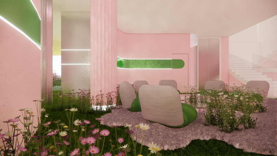 Яркие цвета для первого этажа были выбраны с целью передать красочное детское воспоминание о лете и бабочках в саду. Зеленый цвет ассоциируется с природой, ростом и жизнью, а розовый цвет добавит нежности и тепла.
