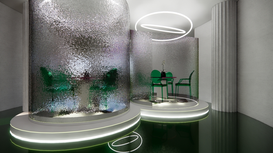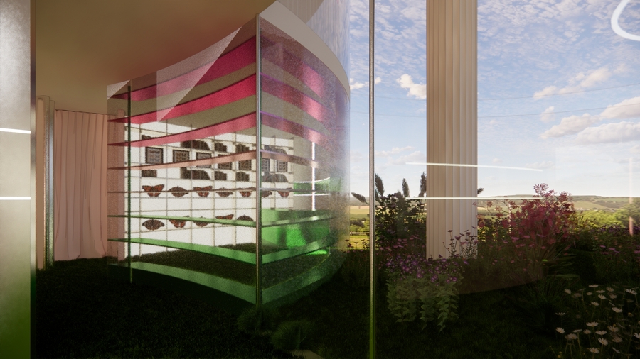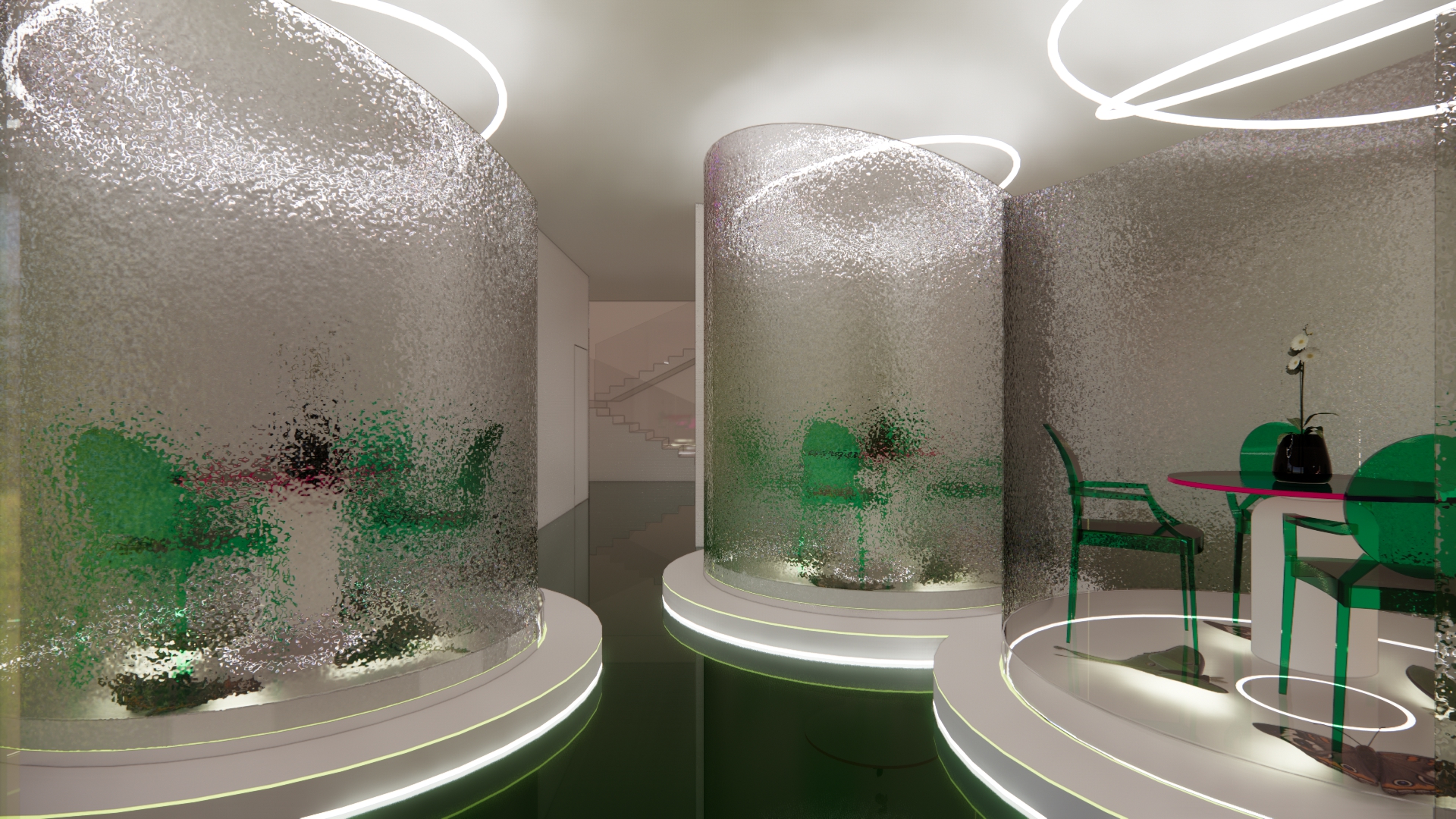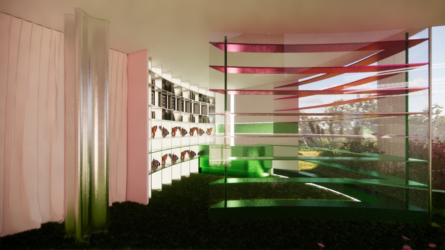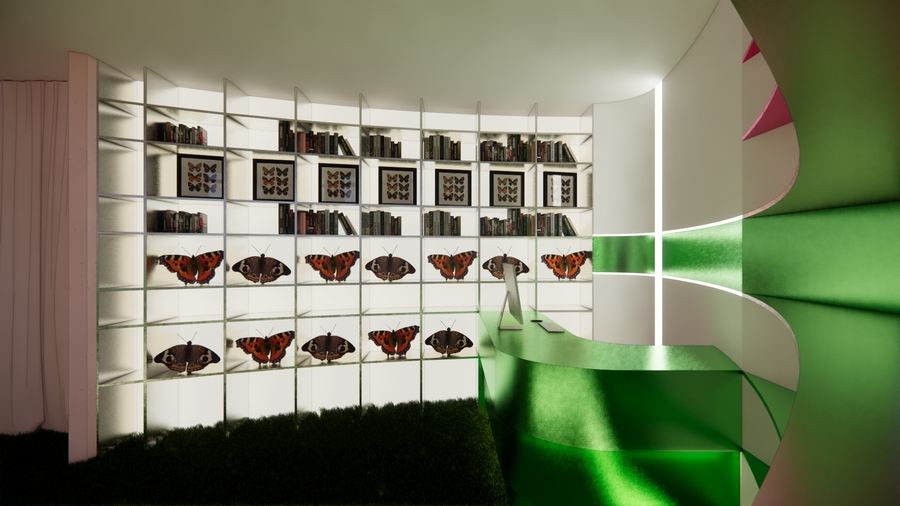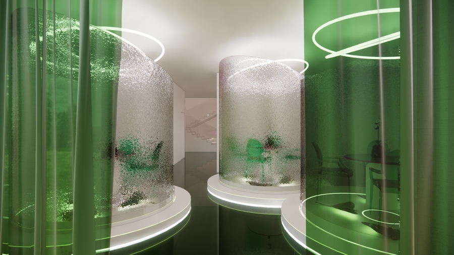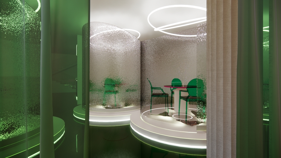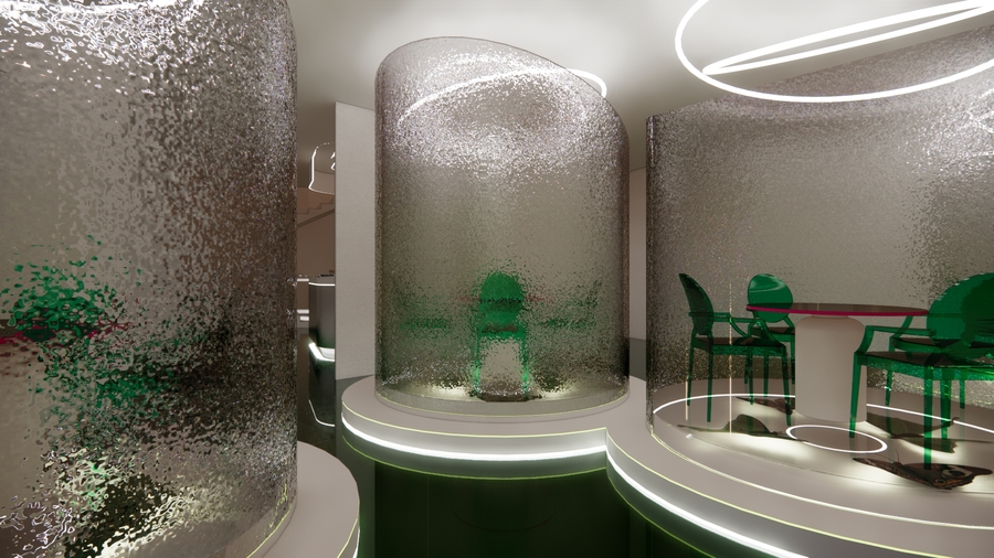 Стеклянные «колбы» являются метафорой кокона и создают изолированную рассадку, под подиумом залиты бабочки с подсветкой.