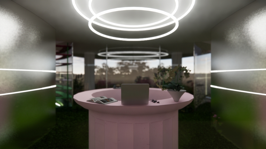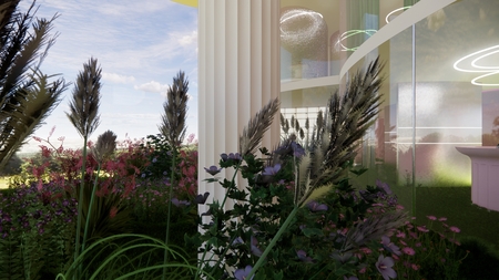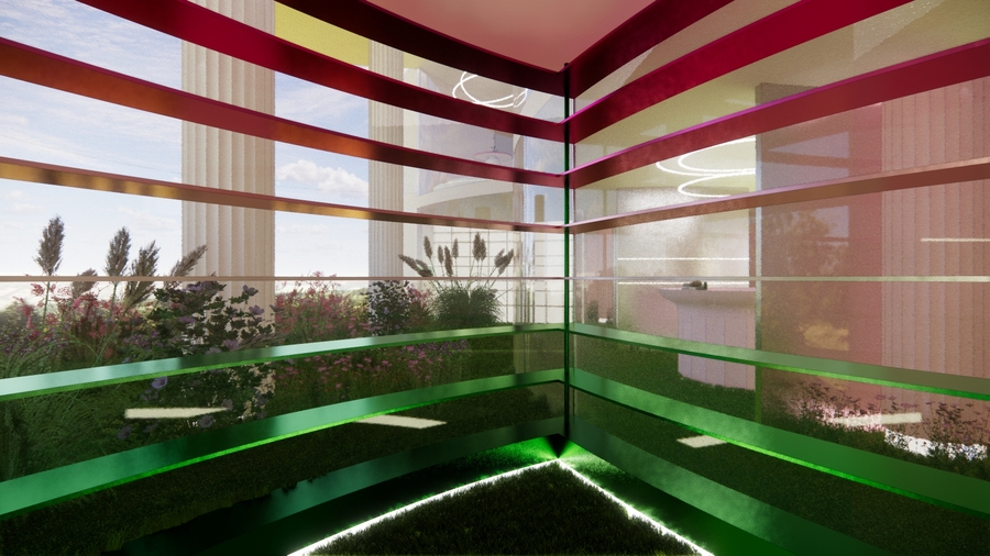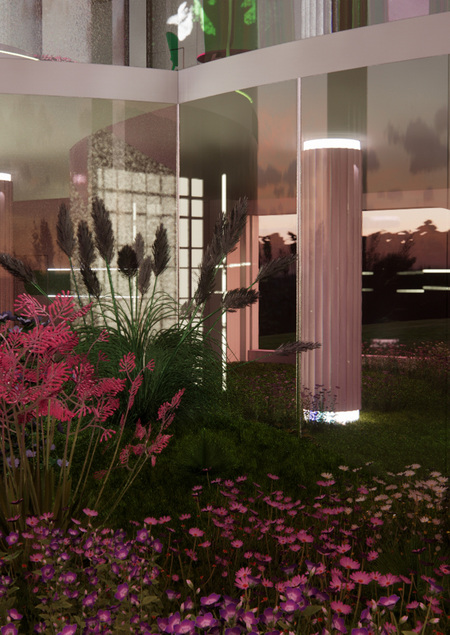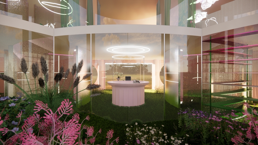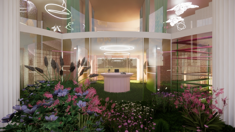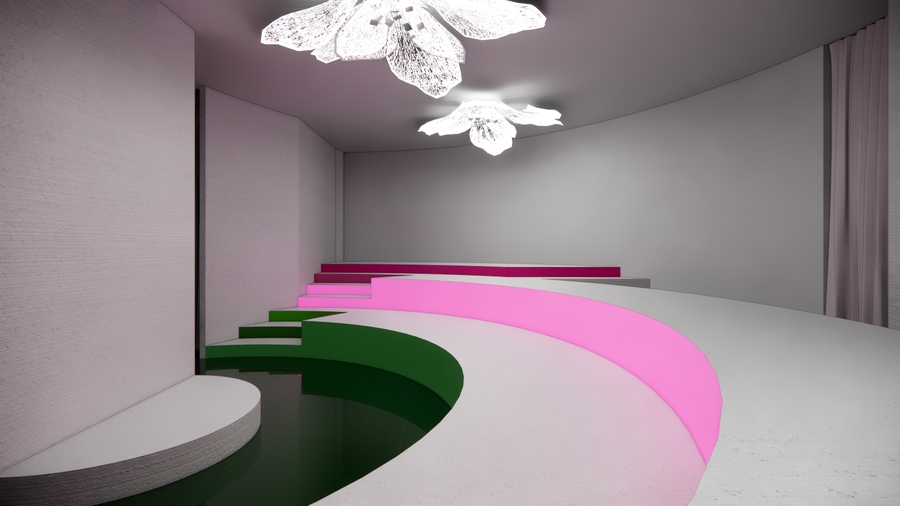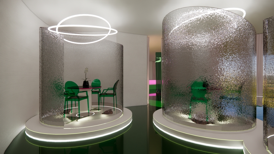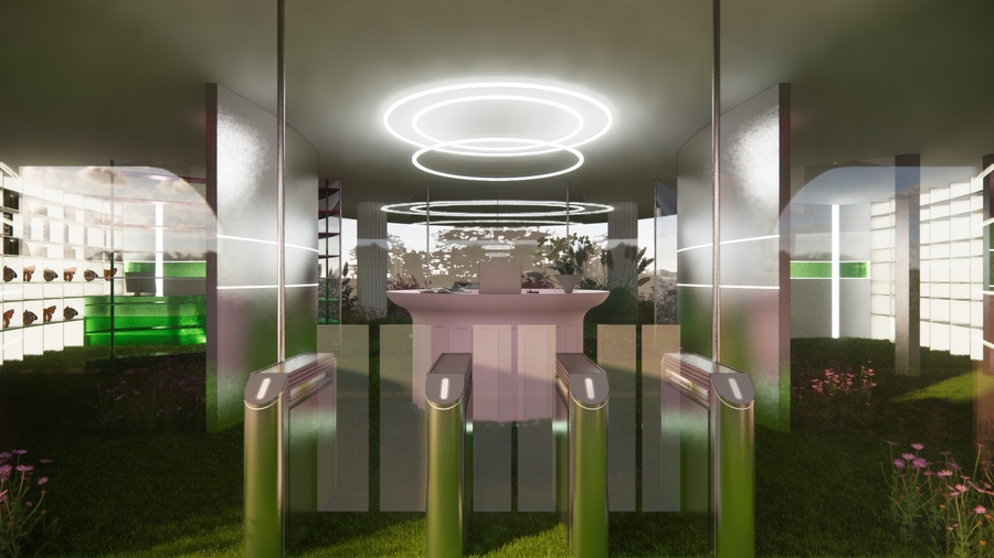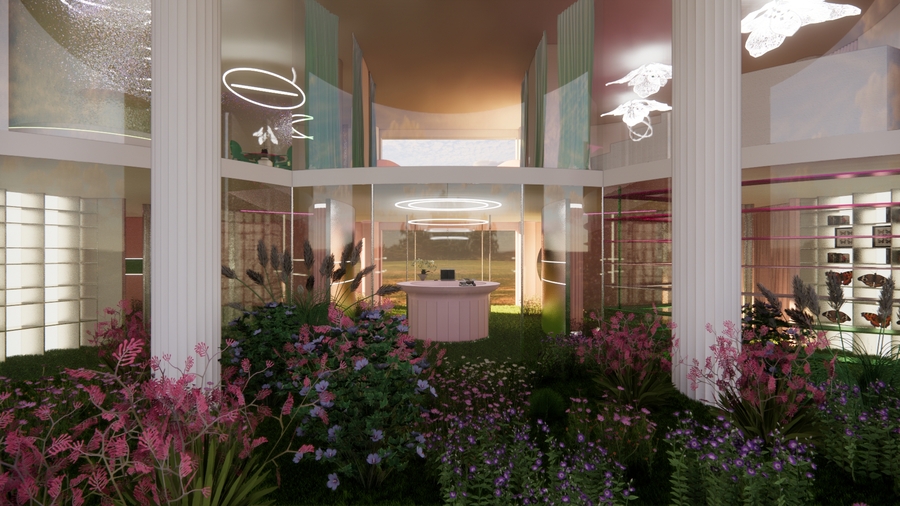 Стеклянные «колбы» являются метафорой кокона и создают изолированную рассадку, под подиумом залиты бабочки с подсветкой.