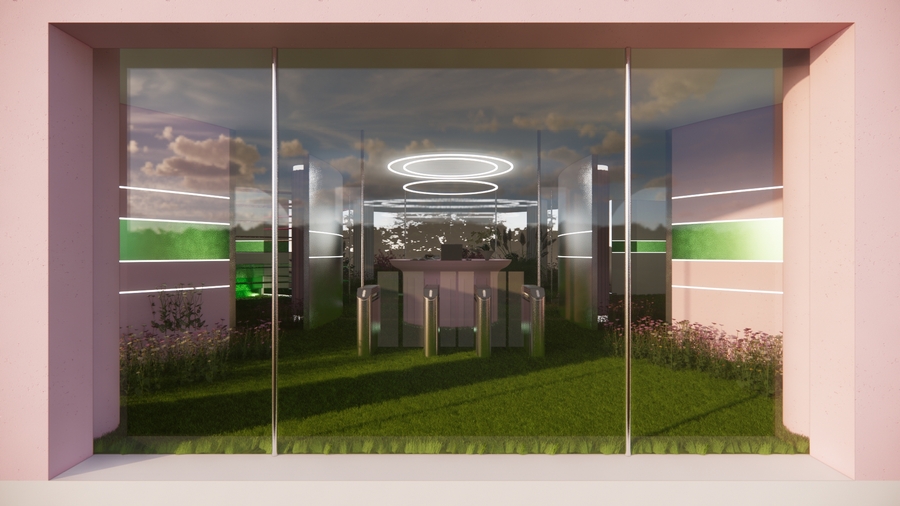 Холл (слева — экскурсовод, справа — директор) Элементы из хрома создают плавный градиент от пола, покрытого травой