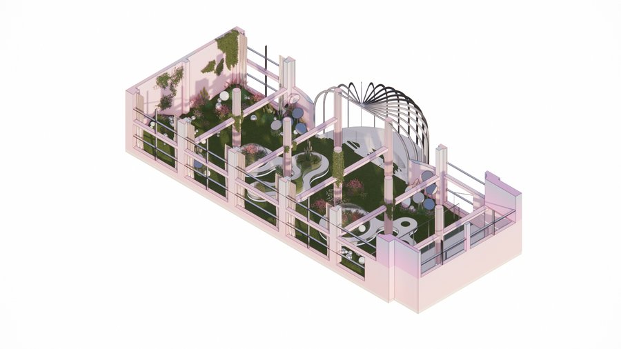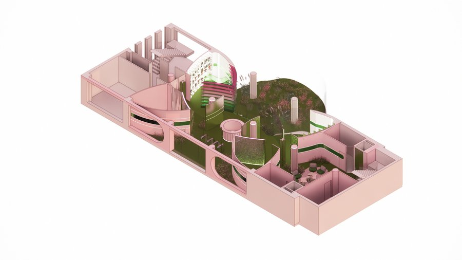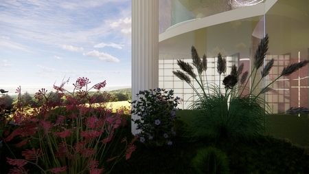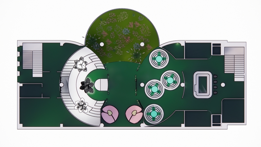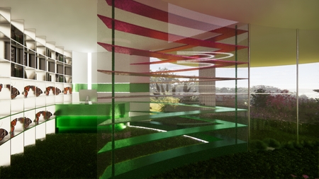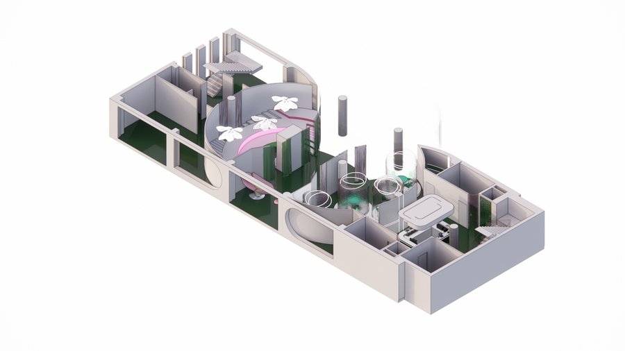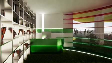 В основу планировочного решения лег принцип симметричных крыльев бабочки, которые возведены в пространстве и обыграны при помощи стеклянных перегородок. Нововведением в исходный план так же стала теплица со вторым светом, где обитают крылатые насекомые. Ее можно посетить пройдя через ресепшн в холле первого этажа, а наблюдать со смотровой площадки второго.