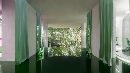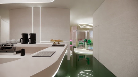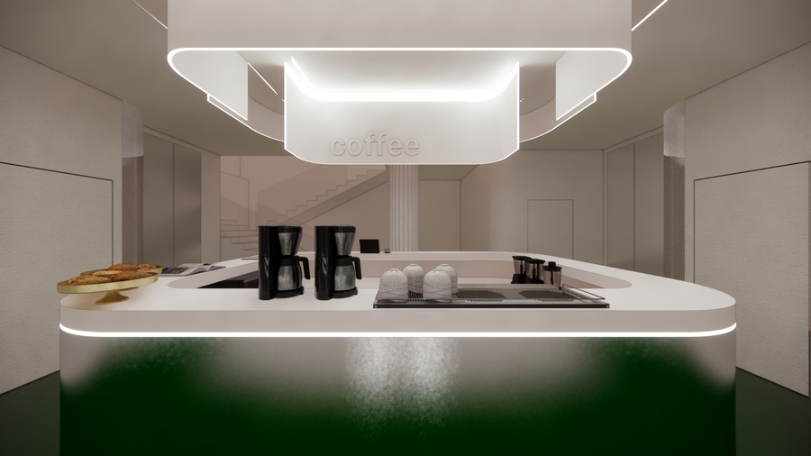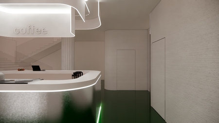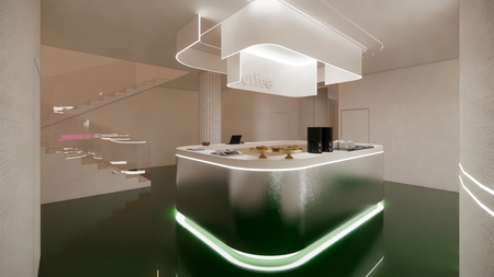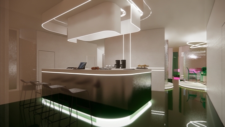 Зеленые полосы с подсветкой пронизывают весь интерьер от входной зоны вплоть до зоны ожидания, помогая интуитивно двигаться в пространстве.