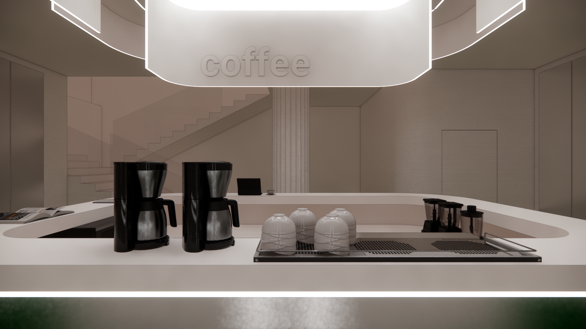 Кафе делится на две части, одна из них представляет собой барную стойку c самообслуживанием, зону выдачи готовой еды и напитков, а вторая посадочные места в куколках/коконах.