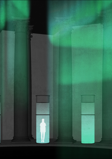 Кульминацией экспозиции является проекционная инсталляция северного сияния в куполе здания.