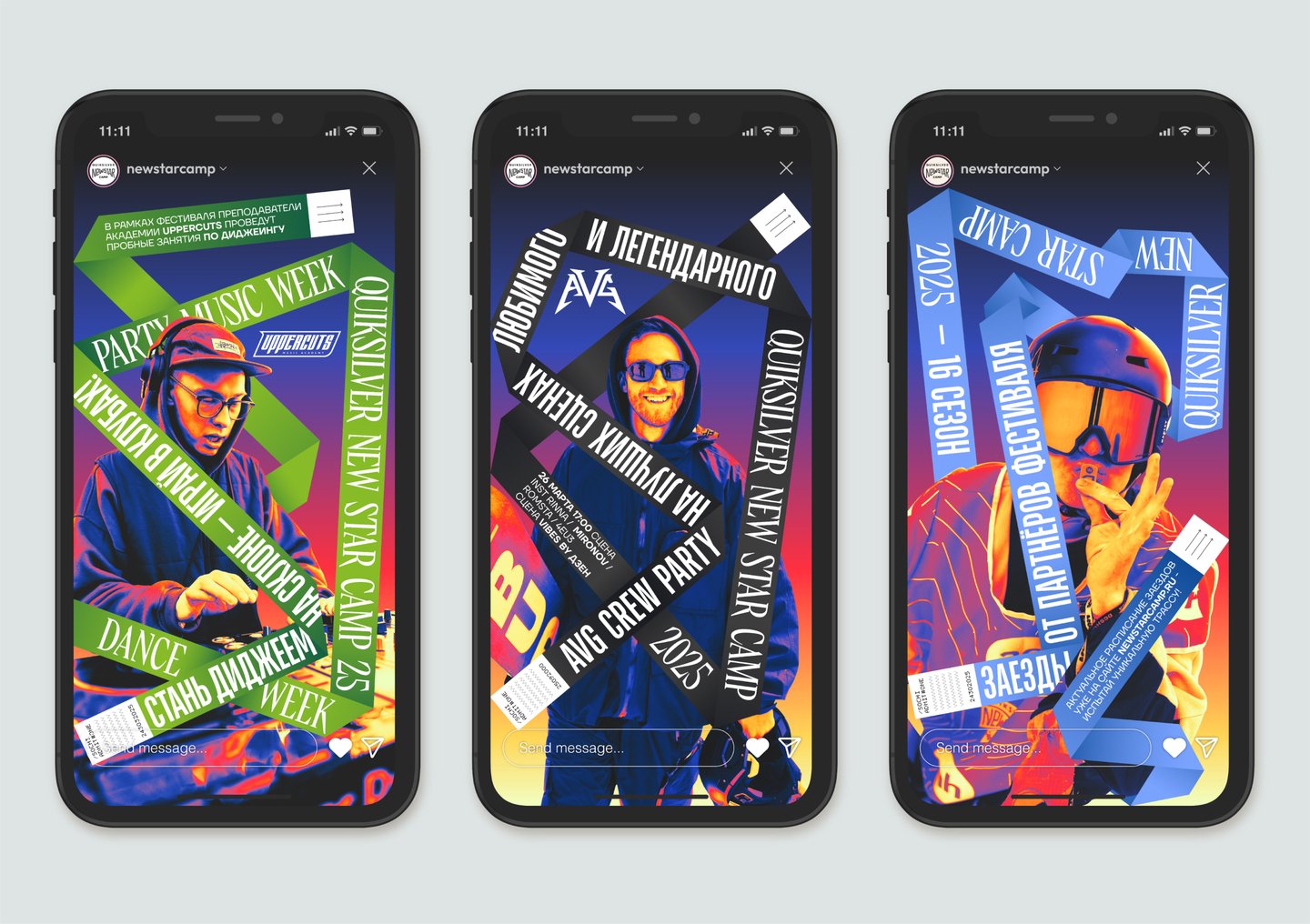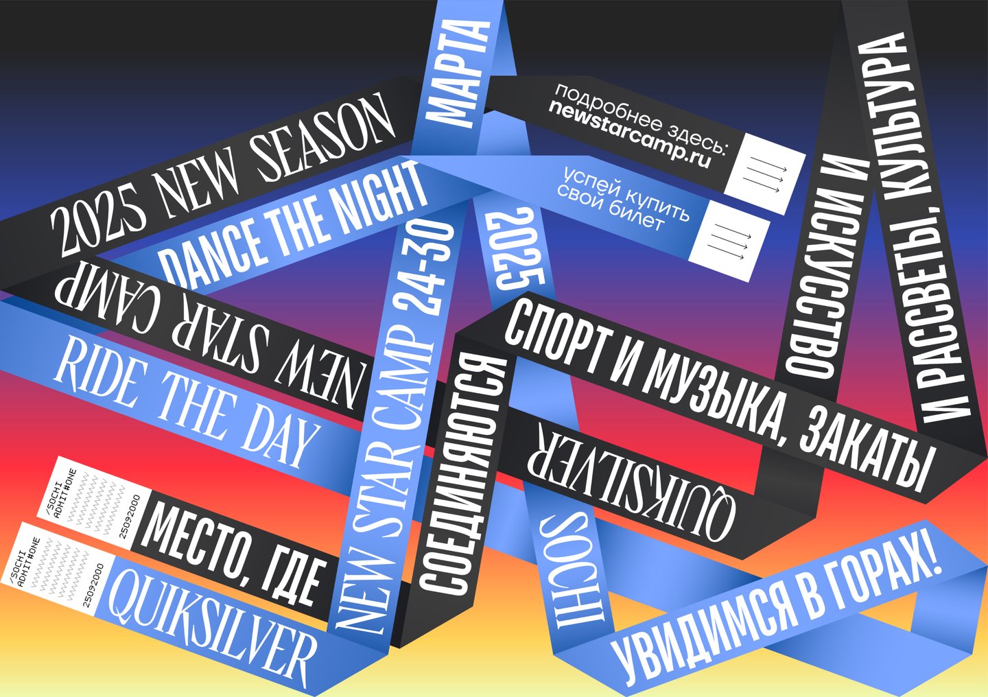 QUKSILVER NEW STAR CAMP is a festival of sports and music that is held annually in the spring in the mountains of the Rosa Huthor Resort (Sochi). In its 15-year history, the festival was the most expected event among the amateurs of extreme sports and mountains, and can rightly be considered the largest and most remembered snowboarding event in Russia. DANCE THE NIGHT RIDE THE DAY Concept for the 16th festival season QUIKSILVER NEW STAR CAMP 2025