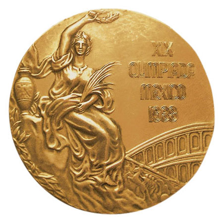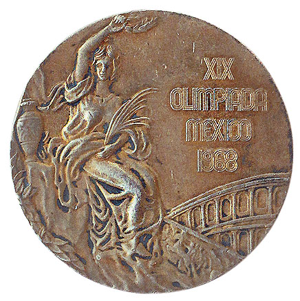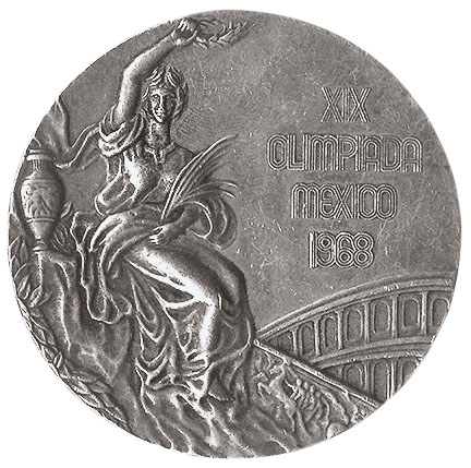 Аверс: сидящая на скале богиня победы с лавровым венком в поднятой правой руке и пальмовой ветвью в левой. Слева от богини панафинейская амфора с изображением античных атлетов, справа — напоминающий римский Колизей амфитеатр. Над ним текст в четыре строки: XIX OLIMPIADA MEXICO 1968 (XIX Олимпиада Мехико 1968).