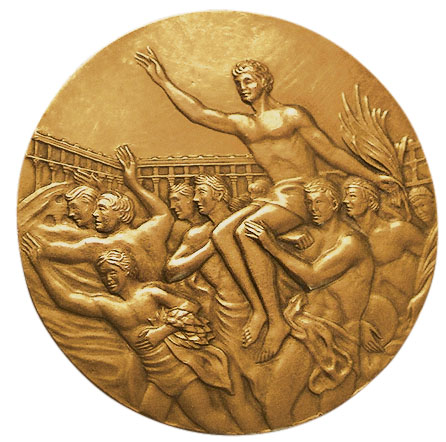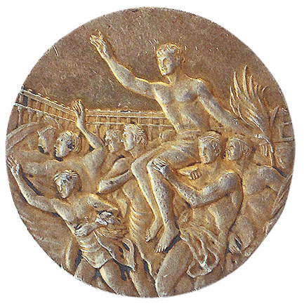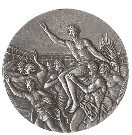Реверс: ликующие атлеты несут на плечах победителя-триумфатора. Его правая рука поднята в приветствии, в левой — пальмовая ветвь. На заднем плане очертания стадиона. Справа, у края медали, инициалы художника: «G. C.».