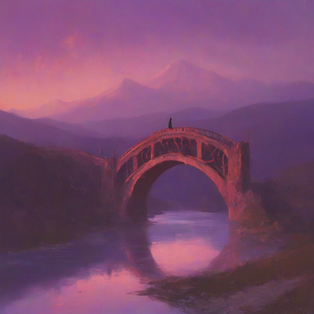 (1) photo in kuindzhi style, alchemist, tower, purple vapors, glowing elixir, middle ages (2) photo in kuindzhi style, arched bridge, mountains, sunset, purple tones of the sky, river