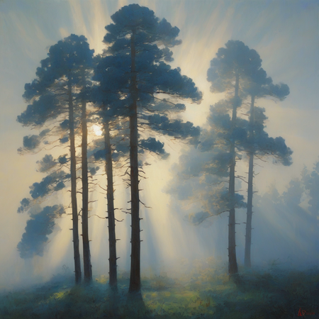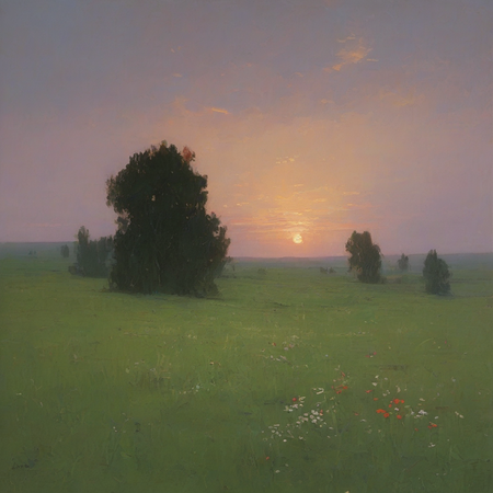 (1) photo in kuindzhi style, pine trunks, bluish fog, sun rays (2) photo in kuindzhi style, blooming meadow, sunset