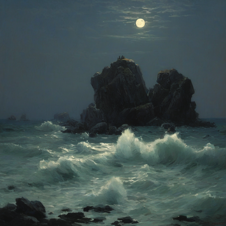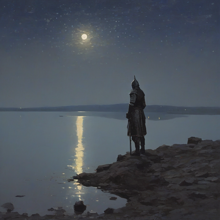 (1) photo in kuindzhi style, lonely knight, lake shore, moon reflection, starry sky (2) photo in kuindzhi style, rocky island, seething waves, moonlight