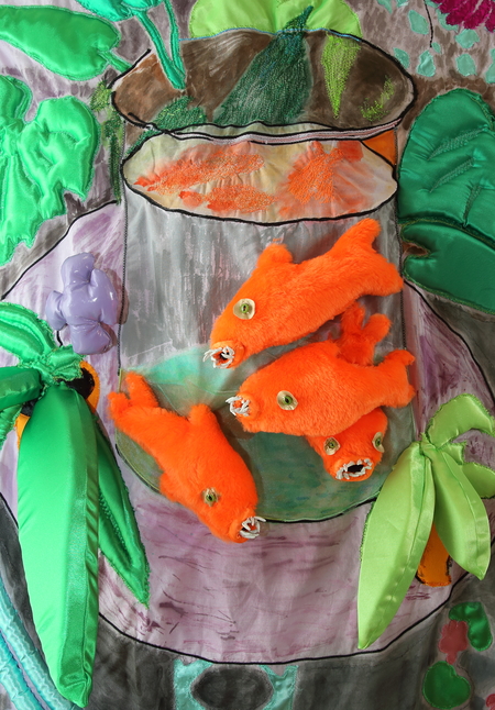 Текстильная работа «Золотые рыбки» представляет собой копию в натуральную величину одноименного натюрморта Анри Матисса 1912 года. Мягкость набитых синтепухом, поролоном отдельных элементов натюрморта и рыбы, выполненные из искусственного меха, сообщают произведению некую плюшевость. В тоже время рыбки обретают зубки. Такой контраст придает хорошо знакомой картине Матисса новое звучание, сопровождая ее негромким, но ироничным комментарием, чем переворачивает восприятие «старого», адаптируя его к новым темам в контексте современного времени.