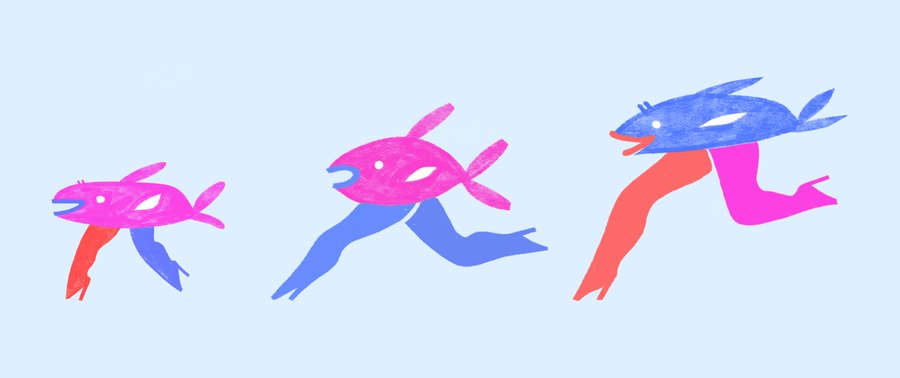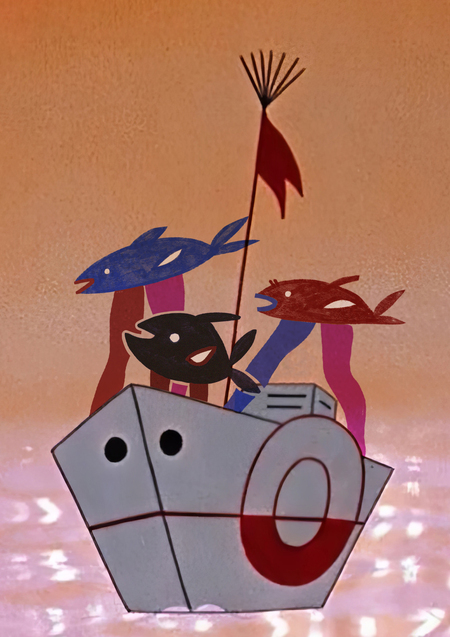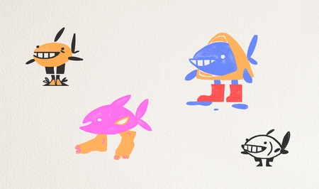 При создании изображений особенное внимание было уделено таким аспектам, как динамика и живость. Не только бегущие и активно шагающие рыбы устремлены в своем движении, но даже статично стоящие персонажи нарисованы в активной пластике.