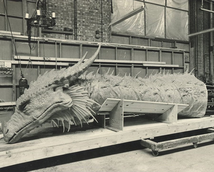 Первое изображение дракона в кинематографе появилось на экране еще в немом кино в 1924 году в Германии. Ровно век назад художник-постановщик картины «Нибелунги» Эрих Кеттельхут создал огромных размеров механизм, управляемый семнадцатью операторами и состоящий из множества подвижных частей, от туловища и лап до головы и пасти. Для координации действий операторов, один из которых управлял четырьмя конечностями, а остальные движениями головы и морды, внутрь тела даже провели телефонную связь.