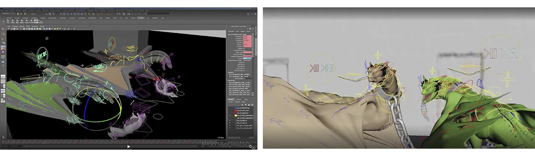Следующий этап — создание анимации с использованием программ Autodesk, Maya и 3ds Max. Для придания кадру наибольшей выразительности и реализма использовали различные симуляции, в том числе и симуляцию аэродинамических труб (сопротивление воздуху). С каждым новым сезоном количество мелких анимированных деталей увеличивалось, появилась многослойность кожи, фиксирование малейшего движения вен и сосудов.