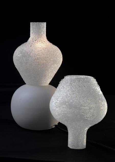 Плафон создавался на 3D-принтере. В рамках эксперимента был выбран полупрозрачный пластик PLA. Путем изменения настроек принтера получилось создать кристаллическую текстуру поверхности, напоминающую горный хрусталь. В качестве источника света используется лампочка Е14.